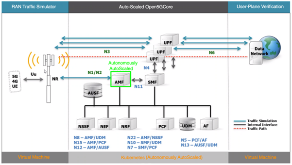 The authors tested and verified the solution architecture and design paradigms in a testbed running on hyperscaler infrastructure with K8s as the de facto 5G platform leveraging existing 5G toolbox components to load the test-deployment and observe the outcomes of the scalability design (see Figure 1).